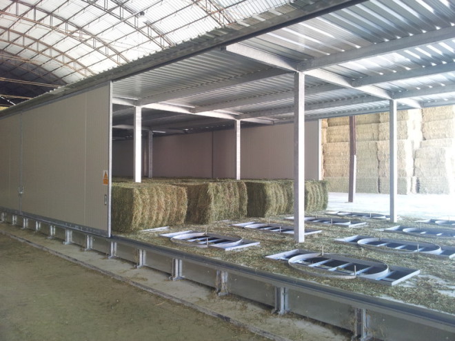 Ce séchoir à foin modèle COMPACT avec recirculation de l'air sèche 40 balles rondes et carrées de fourrage. La charpente métallique est disposée en 4 rangées et peut être chargé/déchargé par un télescopiques par les deux côtés.